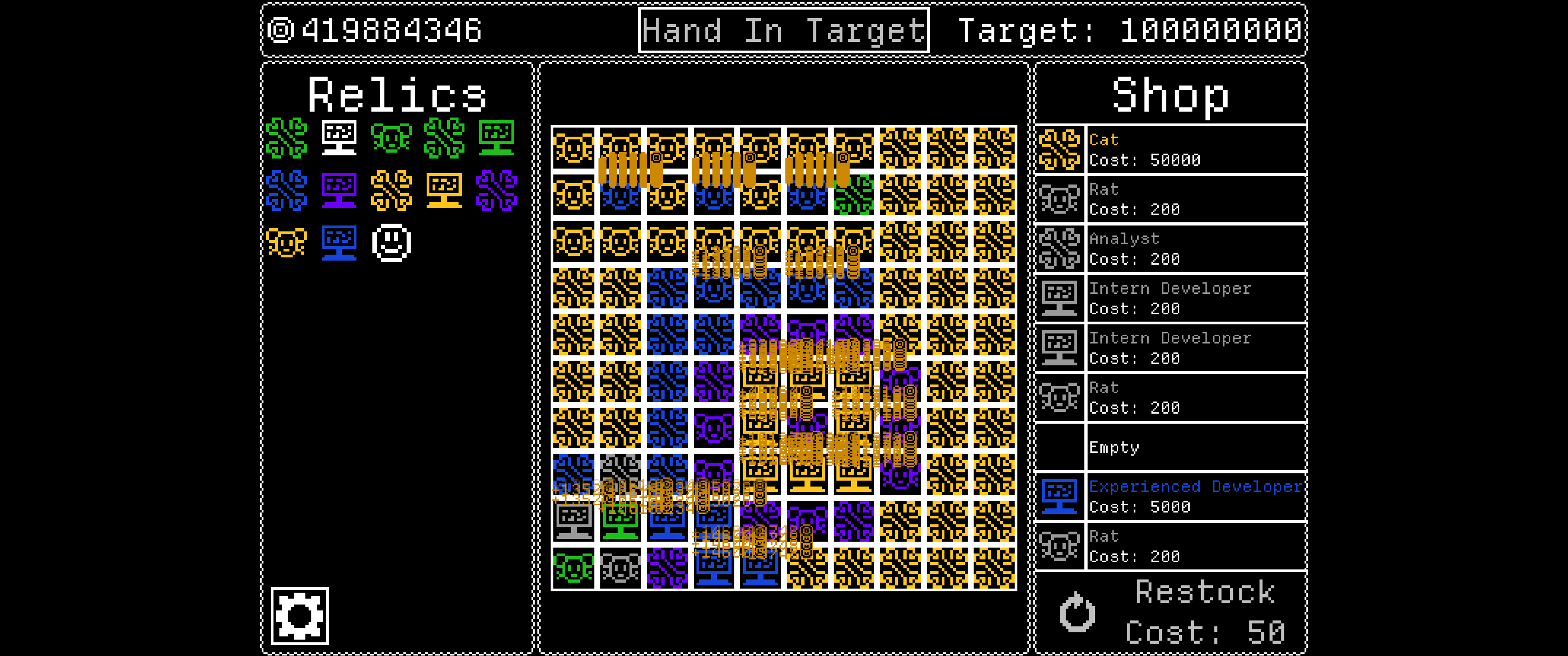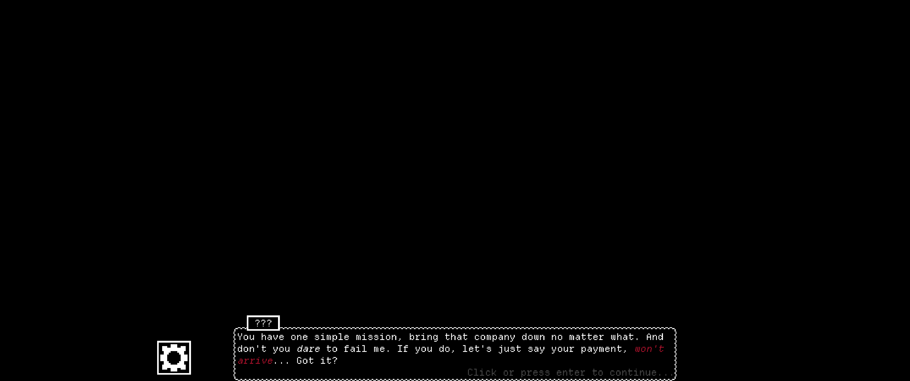 In this game, you're hired to make a rival company, an invincible tech conglomerate, go under by breaking it down from the inside. You start as a developer, but after just a singular day become a manager through serendipity (or might there be a reason?) From there, manage employees and see who they work well with (or not), before ultimately purchasing help from someone far higher up than yourself.